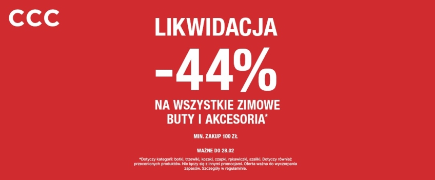 Likwidacja zimowej kolekcji w CCC! -44% na wszystkie botki, kozaki, trzewiki i akcesoria - także już przecenione! Zrób zakupy za minimum 100 zł i zyskaj rabat 44% na zimowe buty i akcesoria. Oferta ważna do 28 lutego lub do wyczerpania zapasów. Szczegóły w regulaminie.